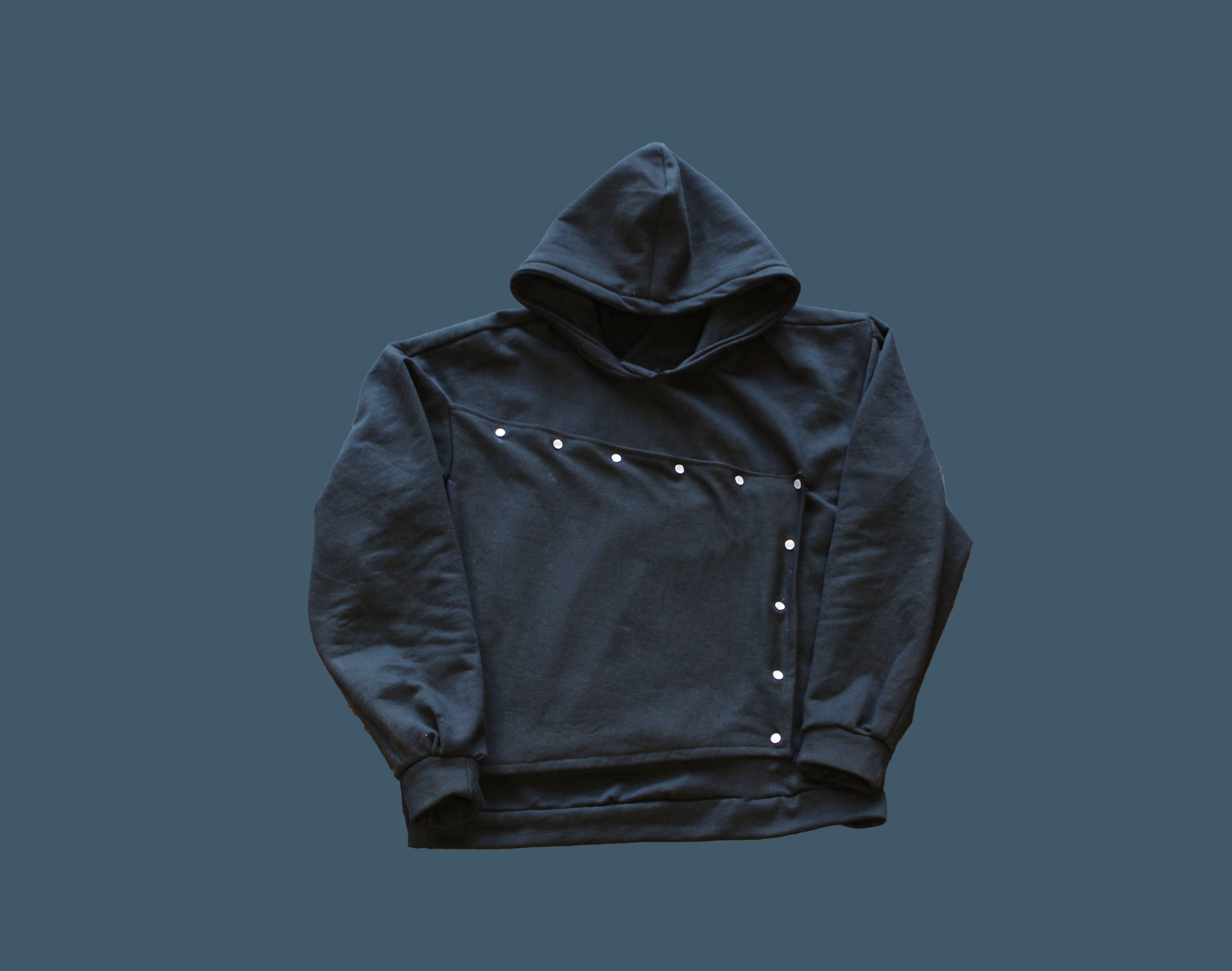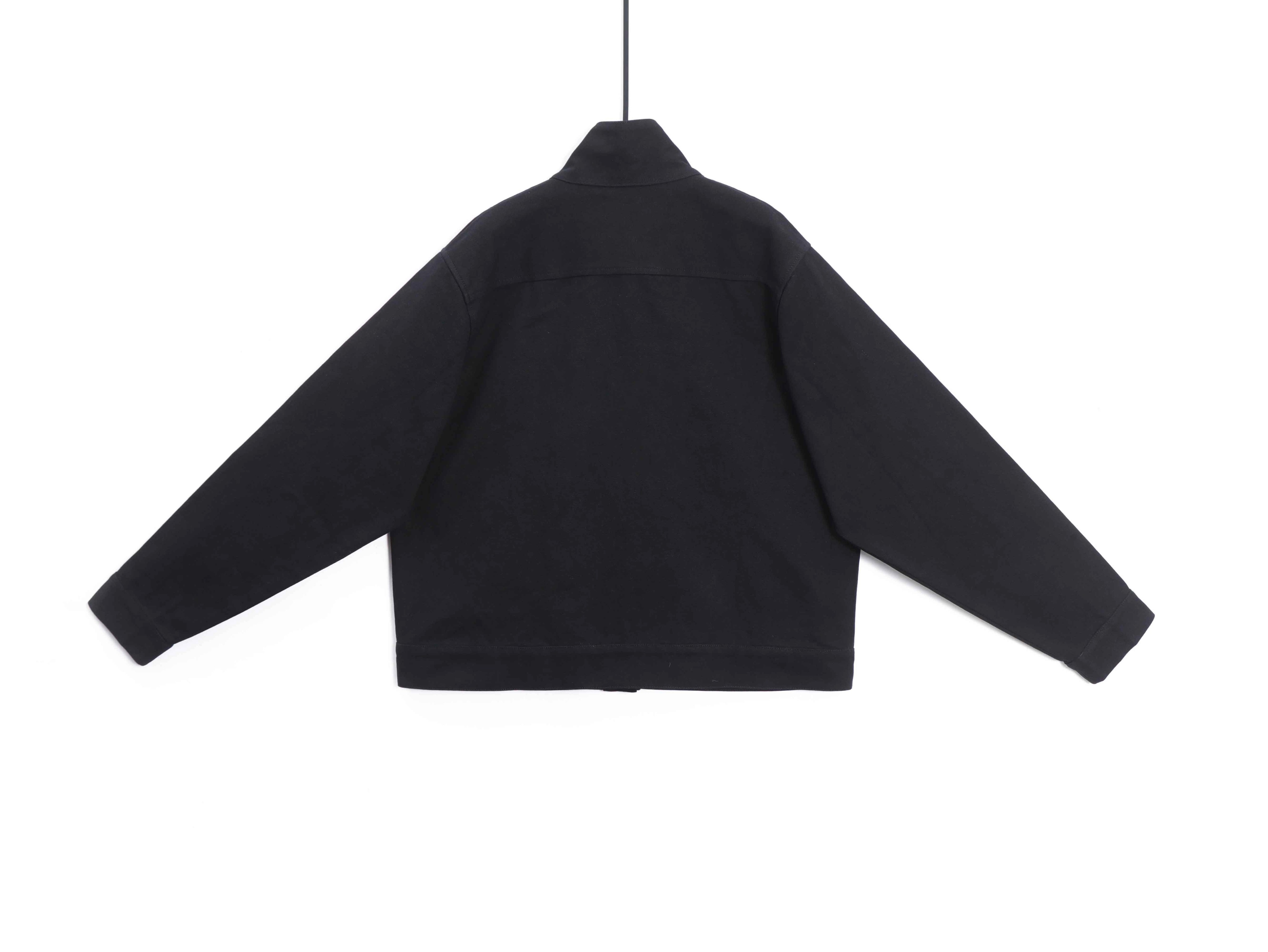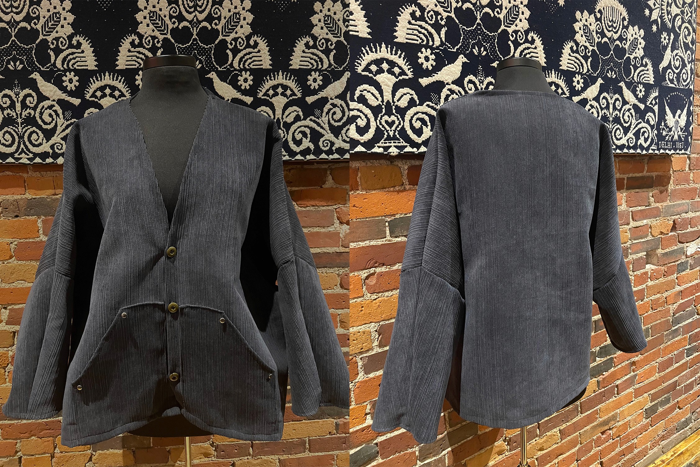 Inspired by vintage military overcoats and flight smocks, for this piece I decided I wanted to blend work wear and casual wear into a piece I could wear daily. Not only could I wear this daily but I wanted it to be very functional for any work scenario I might find myself in. Constructed with a very short sleeve seam and accentuated shoulder cut it creates a silhouette that is perfect to be dressed up or down. Made from heavyweight navy corduroy fabric and finished with metal rivets.