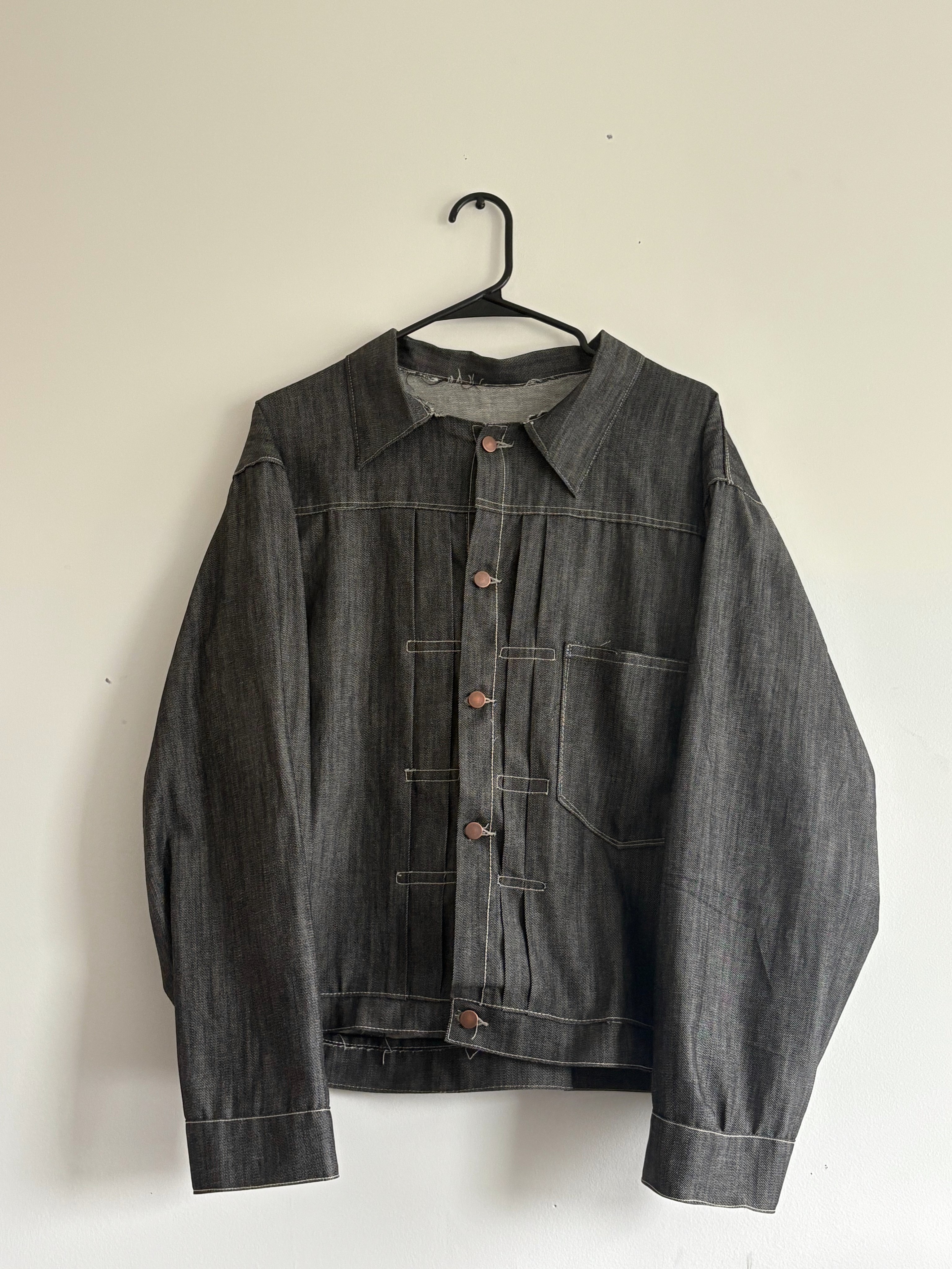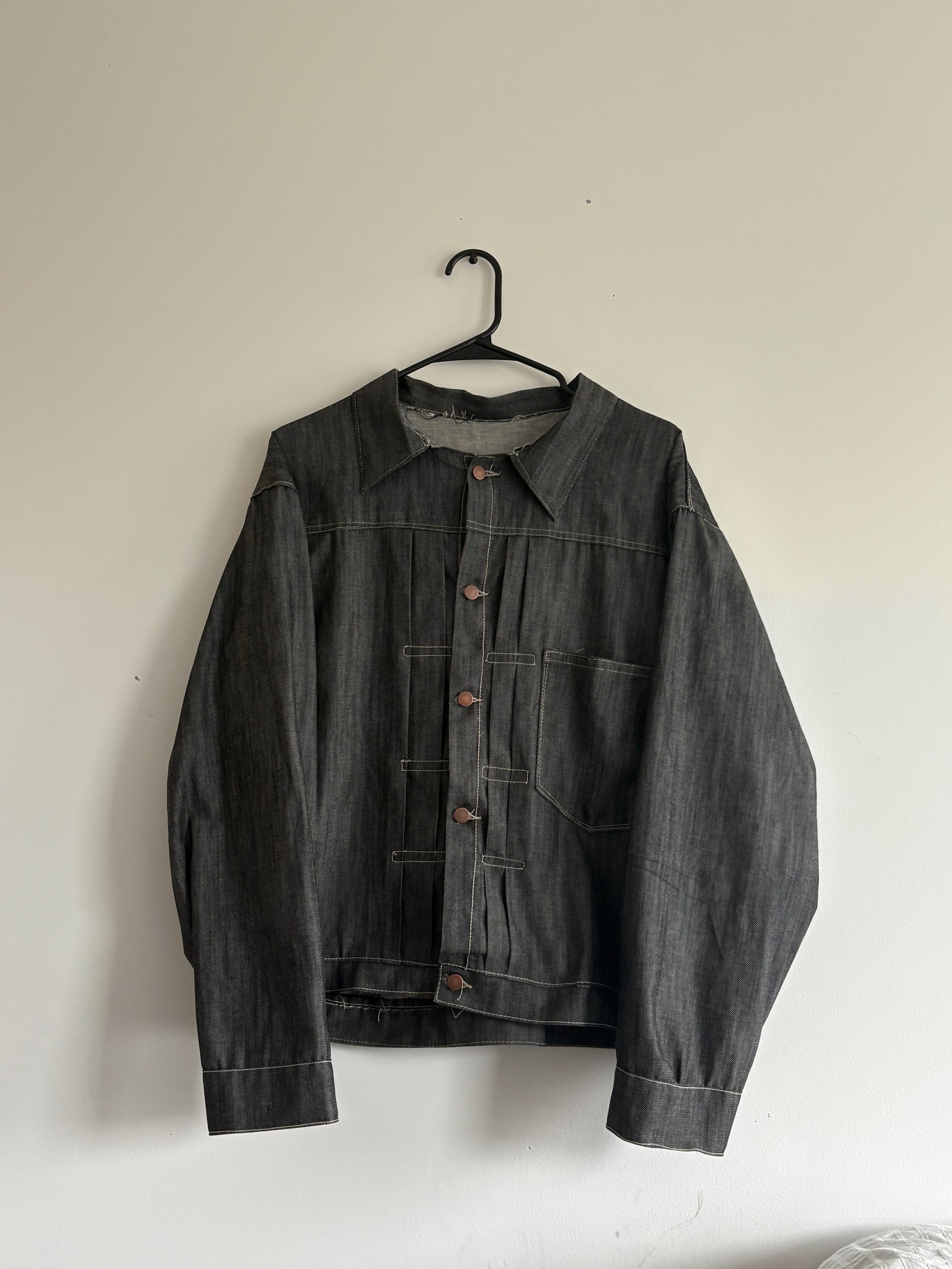 Constructed from 12 ounce welterweight denim. following a pre war type one silhouette. Copper hard wear with the back pleat venting system. Written concurrently with a 12 page garment analysis as in depth study of construction.