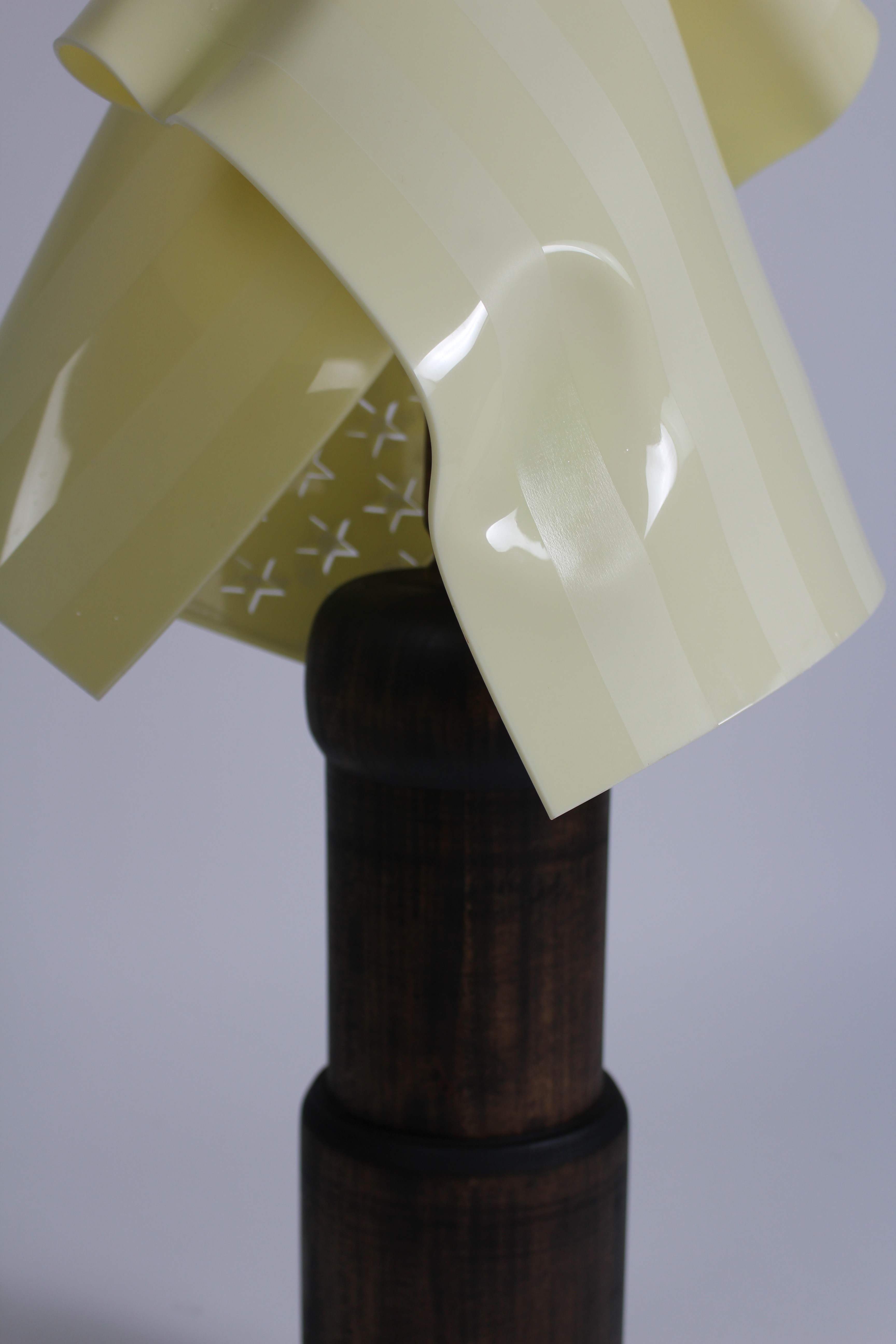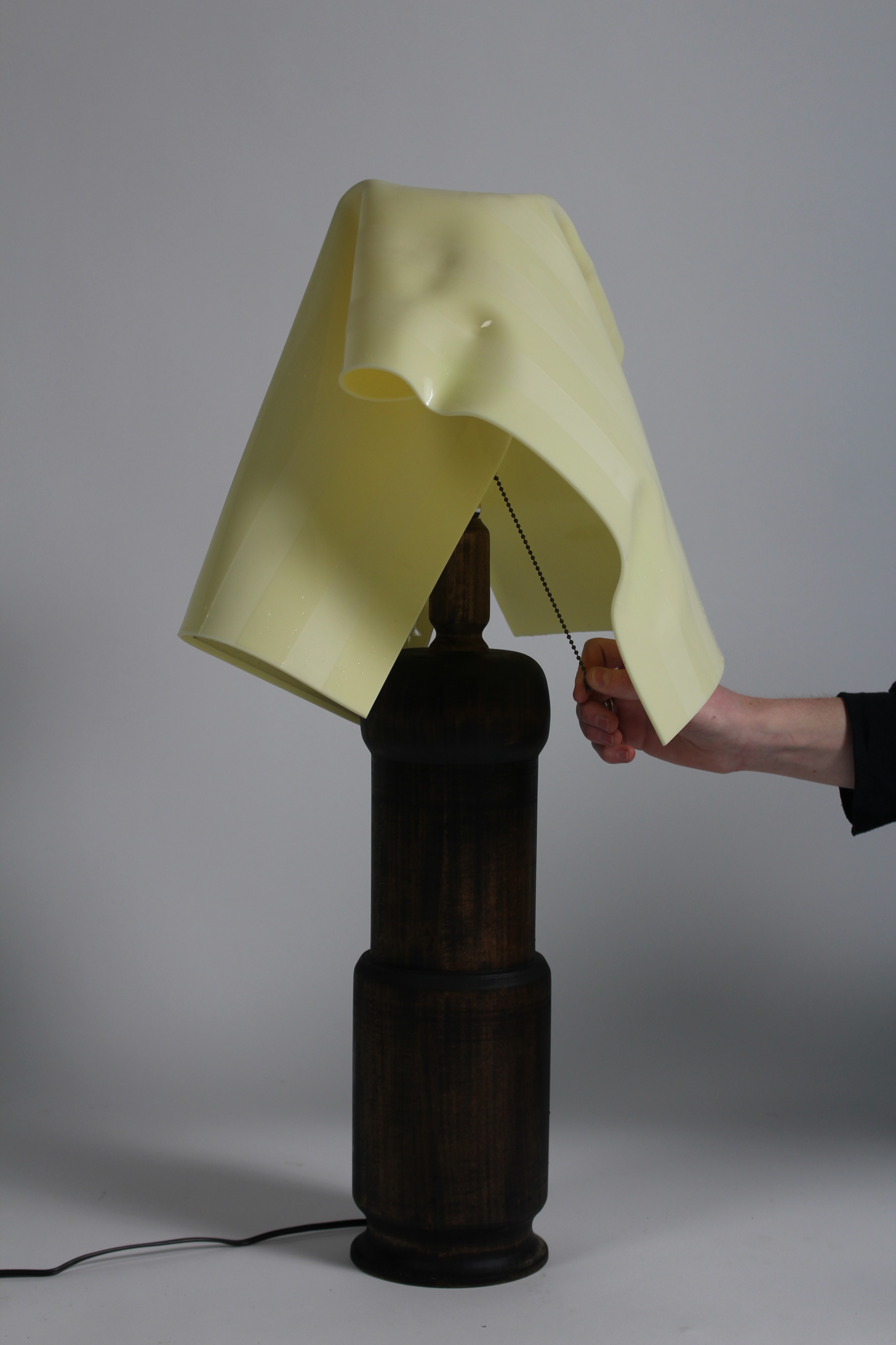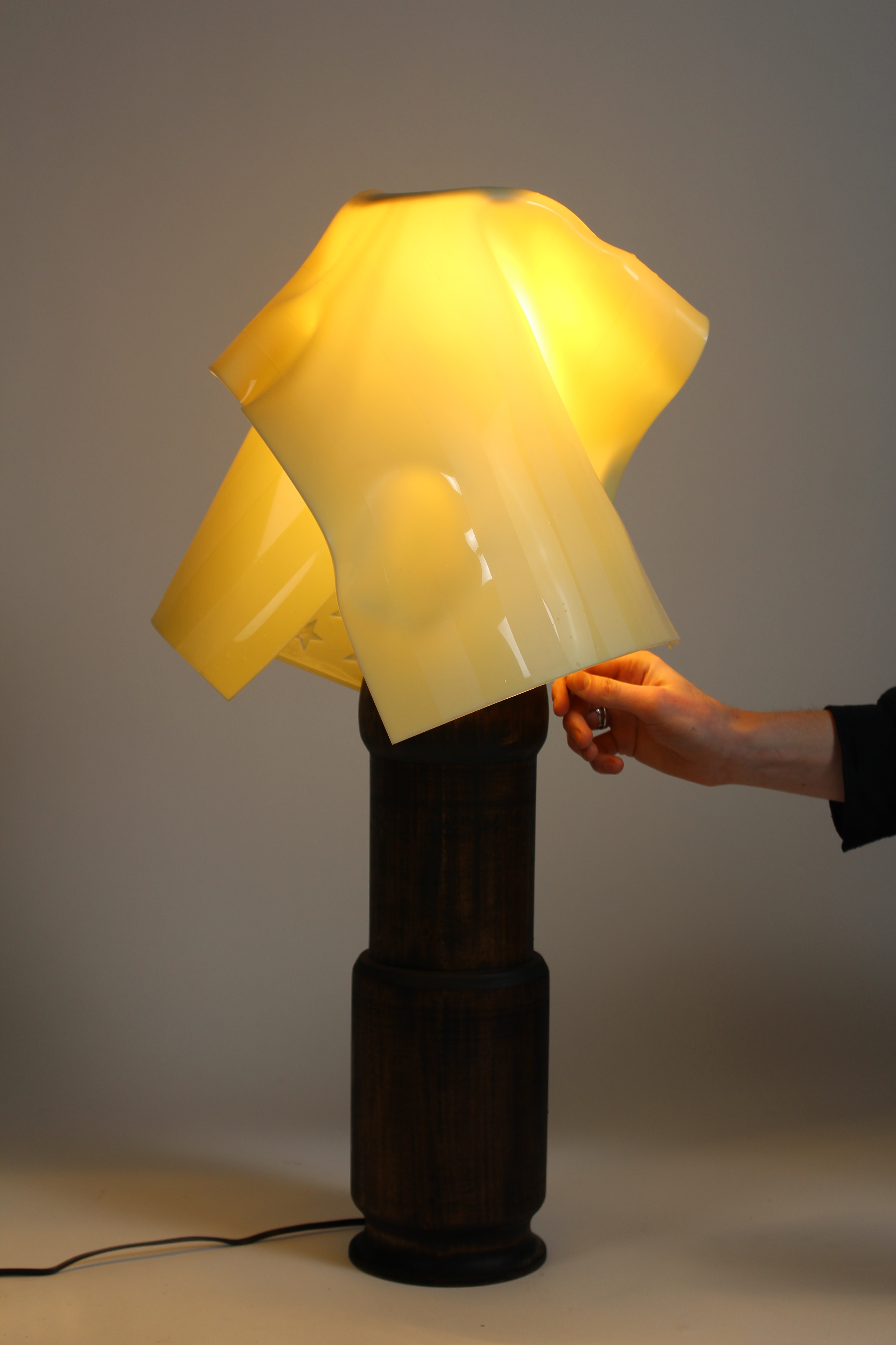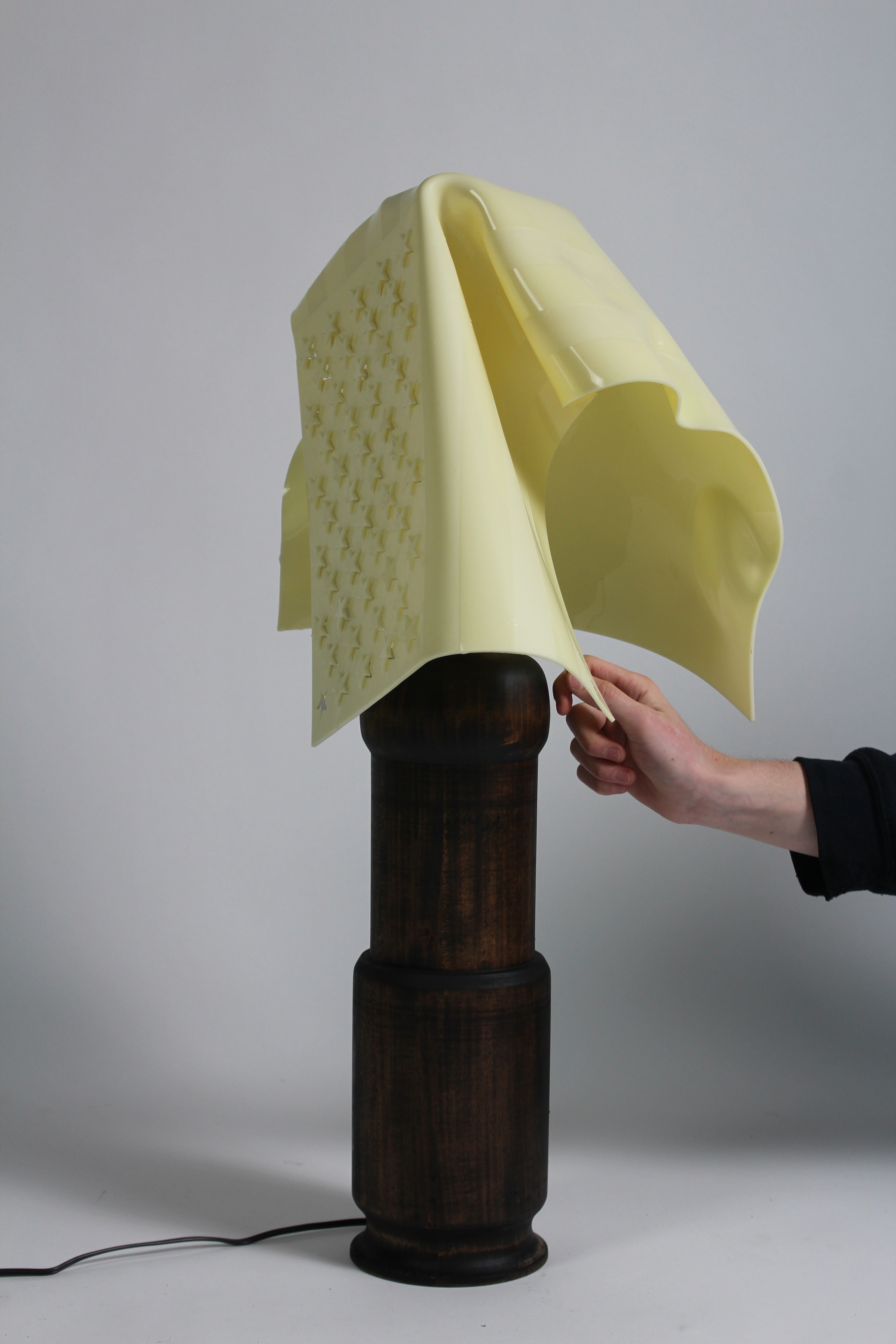 “Windblown” is a classical lamp featuring a mahogany stained basswood bass formed to fit traditional standards that serves in contrast to the contemporary material of the shade. The shade is constructed from ⅛” extruded acrylic plastic. This lamp shade is cut from an ivory color to mimic an american flag that is then molded over the bulb to give the Trompe-l'œil feeling of a real linen american flag draped over a lampbulb. It is inspired from civil war era paintings and the frequent iconography of draped and windwhipped american flags in andrew wyeth paintings. “windblown” is a modern take on the multi function use of an american flag often times used as a lamp shade, a symbol of liberty, a symbol of oppression and everything in between.