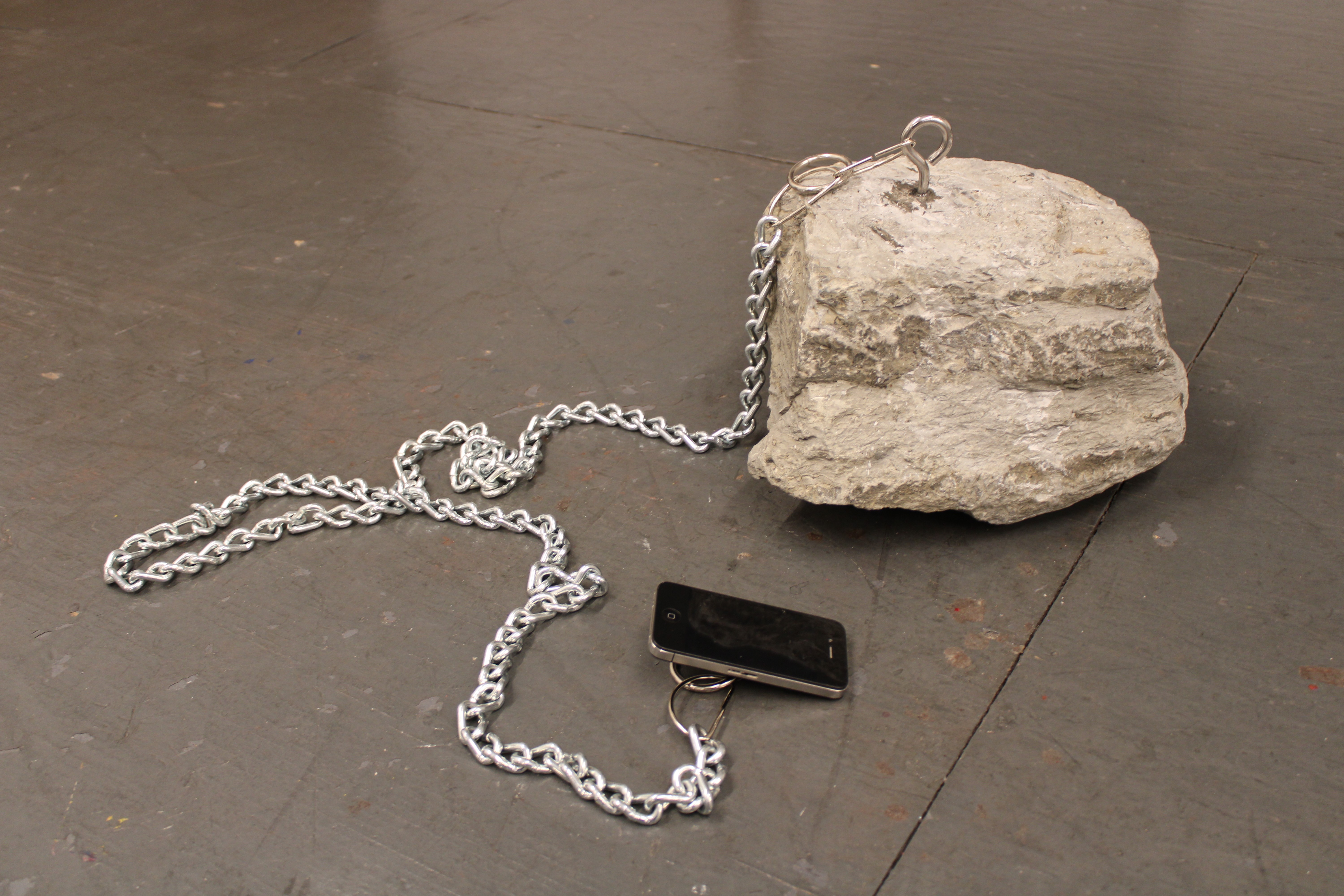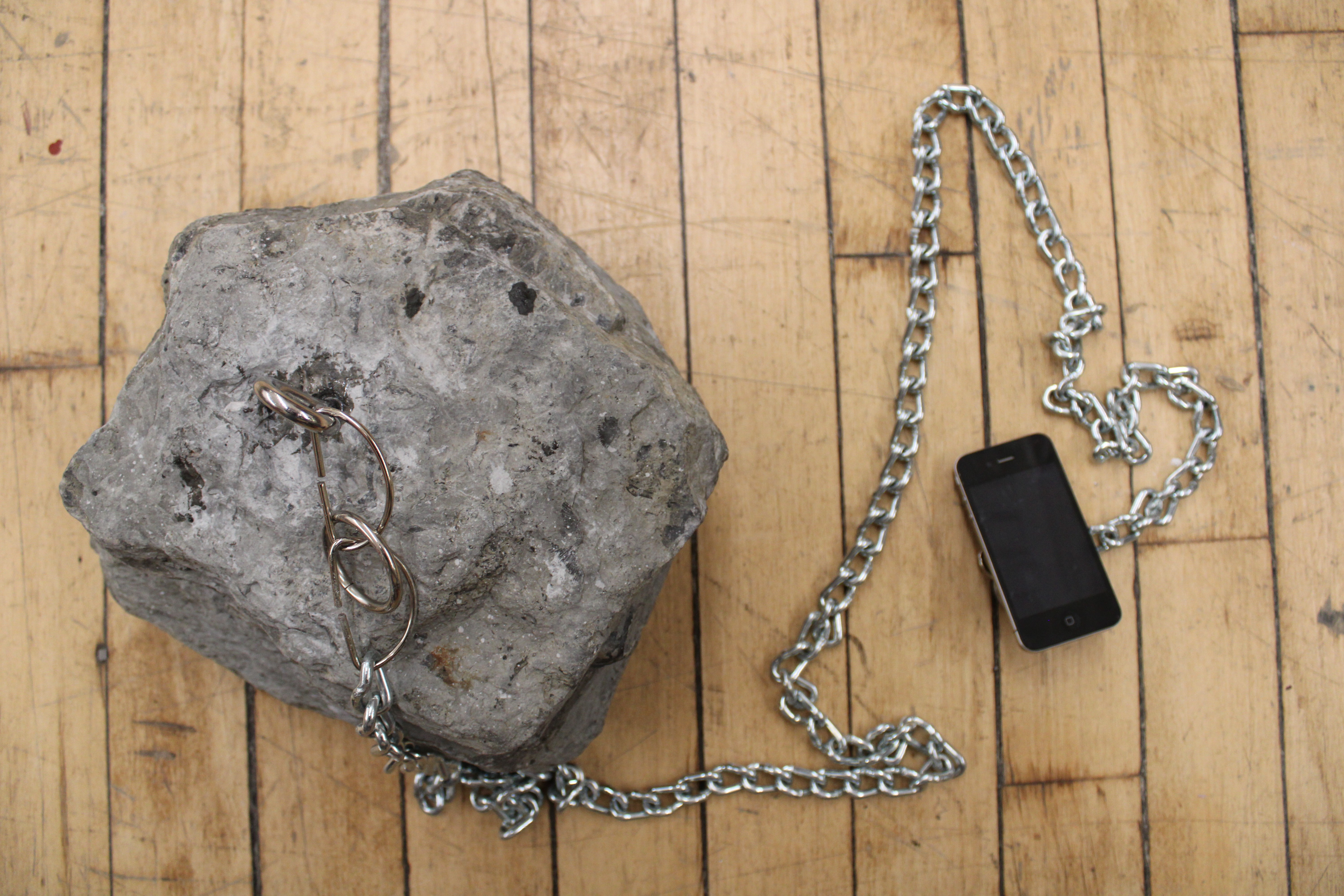 Whilst trying to identify what chindogu is at its core, it led me to the belief that it was solving problems in inefficient ways and these inefficiencies (often times absurd) is what leads to the humorous or facetious element of this design philosophy. This led me to trying to figure out how to slow down fast things, make abrasive surfaces rough, and, more importantly, how to make convenient products inconvenient, because this is where I thought that the strongest contrast was hiding. Our phones are convenient, but convenience to a fault can lead to addiction, phone addiction being something that my generation, nihilistically including me, has just accepted as an inevitability. My chindogu device uses the geological to anchor the technological in order to make the slow fast and the convenient a hassle. “Landline” is a device that chains your phone to a boulder or to land through a line. This effect makes the mobile immobile and cures phone addiction through an earthly intuitive manner.